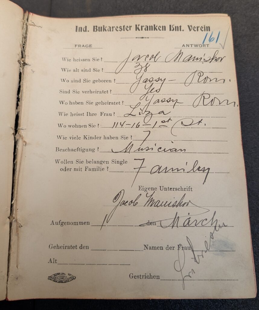 Application for membership of musician Jacob Manishor to a Bucharester landsmanshaft, c.1905. Source: YIVO, RG 826 Independent Bukarester Sick Aid Association Records collection.